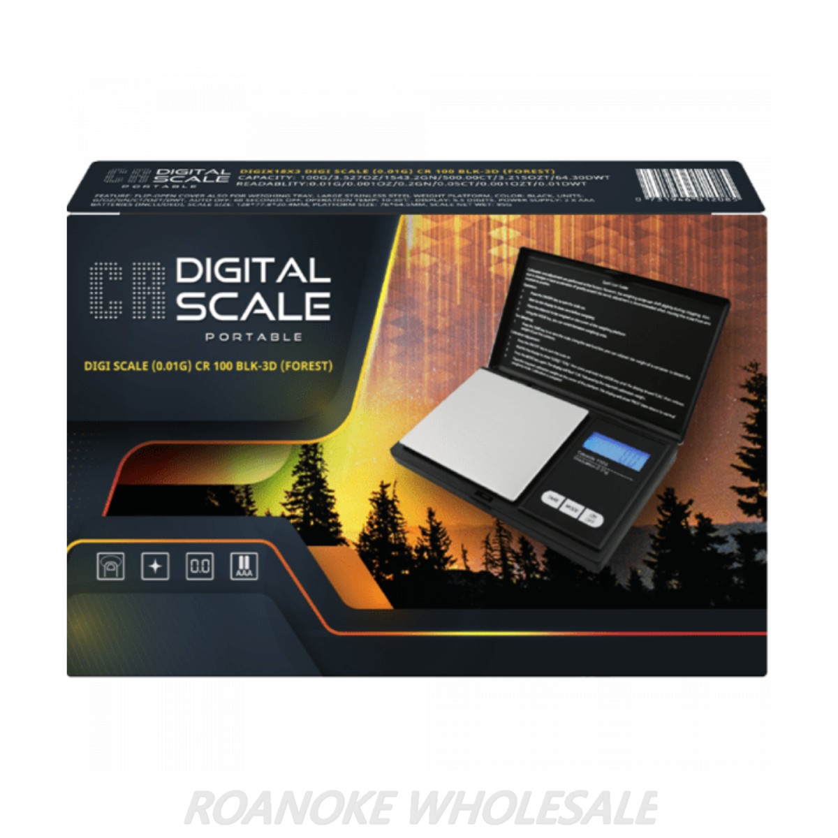 Item# : DIGIX18X3 Capacity : 100g (3.52oz) Readability : 0.01g Power : Two AAA (included) Platform Size : 76 X 64.5 mm