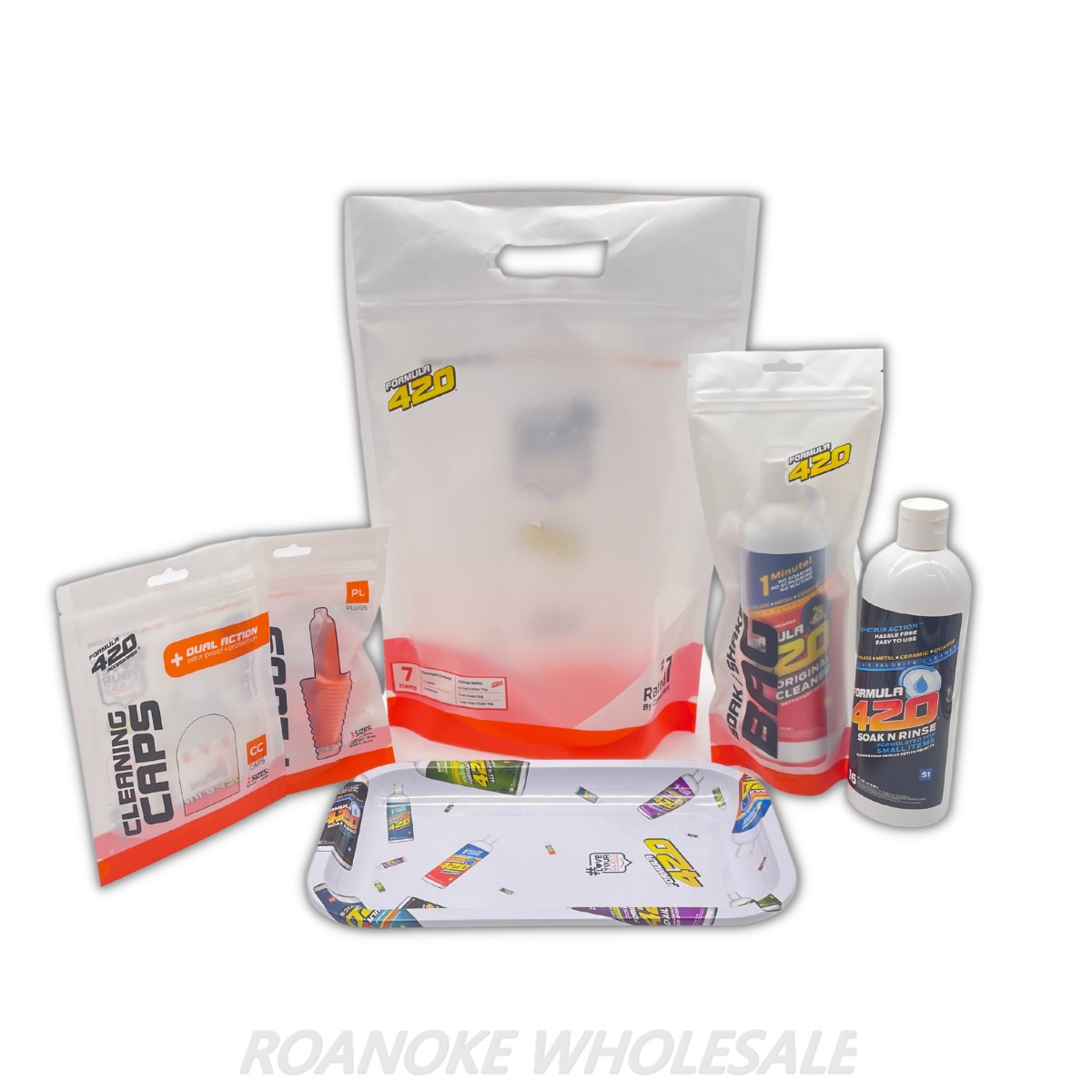 The Kit comes with: x1 Bottle of A1 x1 Bottle of S1 x1 Set of cleaning caps x1 Plug Set x1 Metal Tray x1 Soak/Shake Bag x1 Large Soak/Shake Bag
