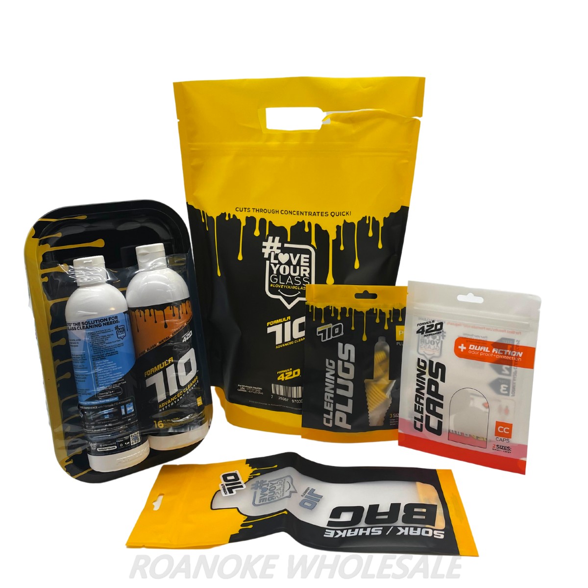 The Kit comes with: x1 Bottle of A1 x1 Bottle of S1 x1 Set of cleaning caps x1 Plug Set x1 Metal Tray x1 Soak/Shake Bag x1 Large Soak/Shake Bag