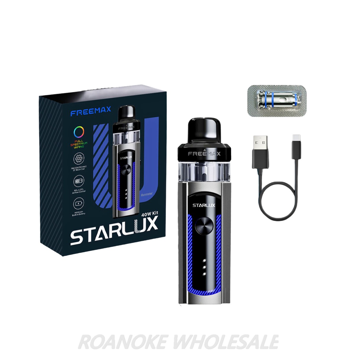 Freemax Starlux Kit Features: Pod Capacity: 4mL (TPD: 2mL) Coil Resistance: 0.5ohm / 0.35ohm Battery Capacity: 1400mAh Output Power: 40W Type-C Charging Port