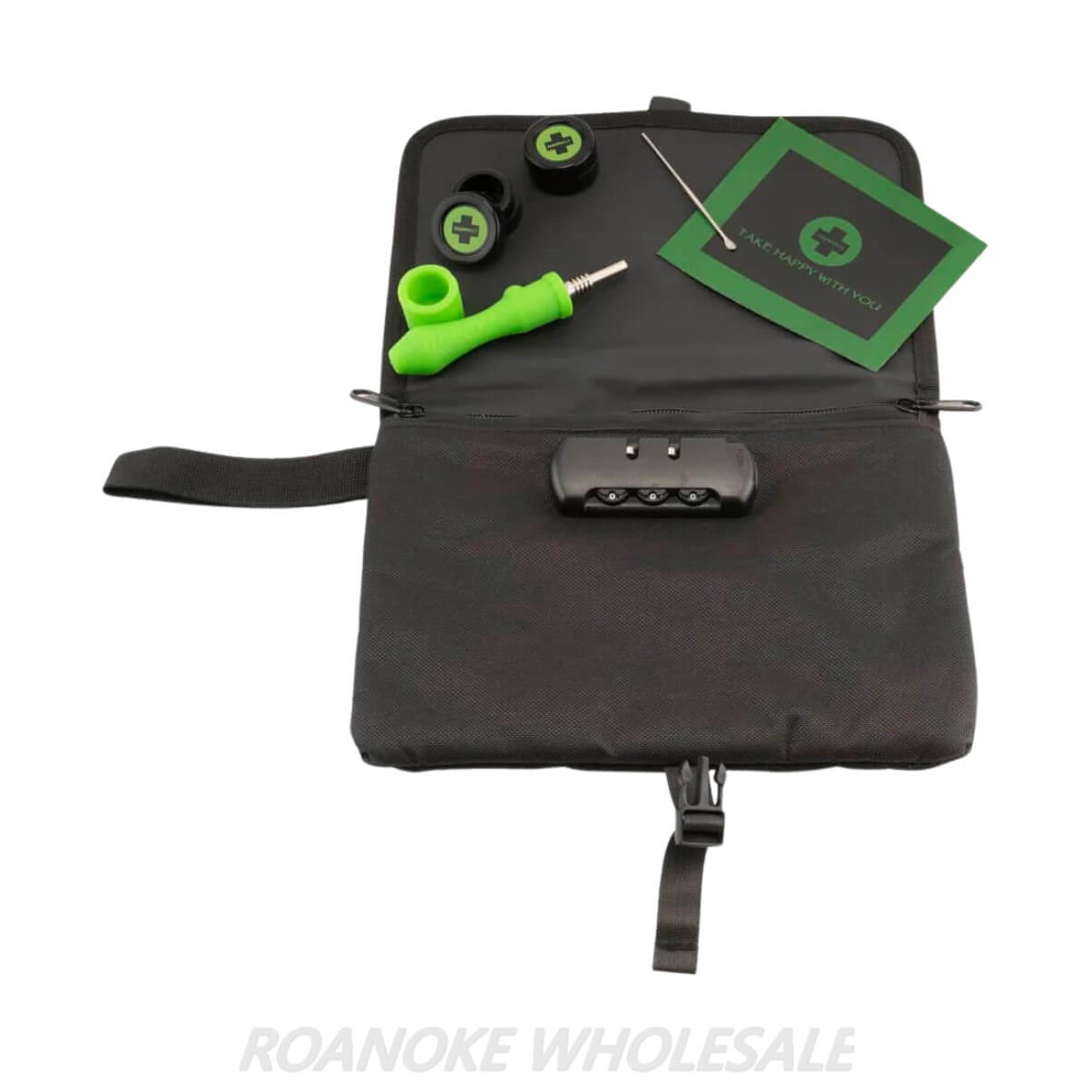 Happy pouch DAB includes the following: Smell-proof, lockable Pouch with cover/rolling tray Silicone Nectar Collector Dab Tool 2 x wax containers