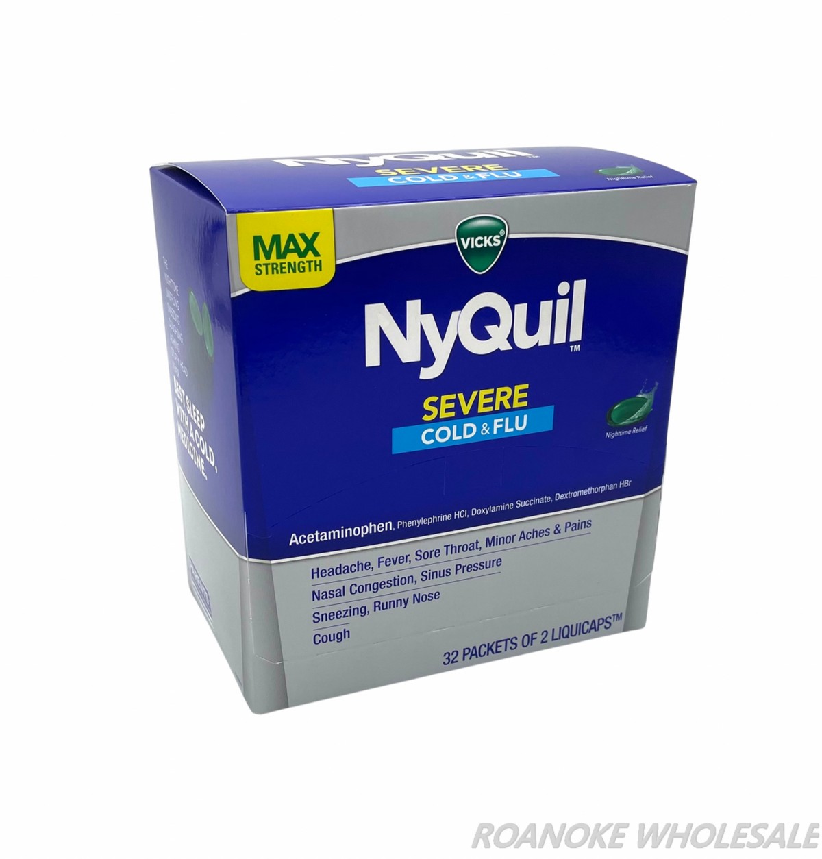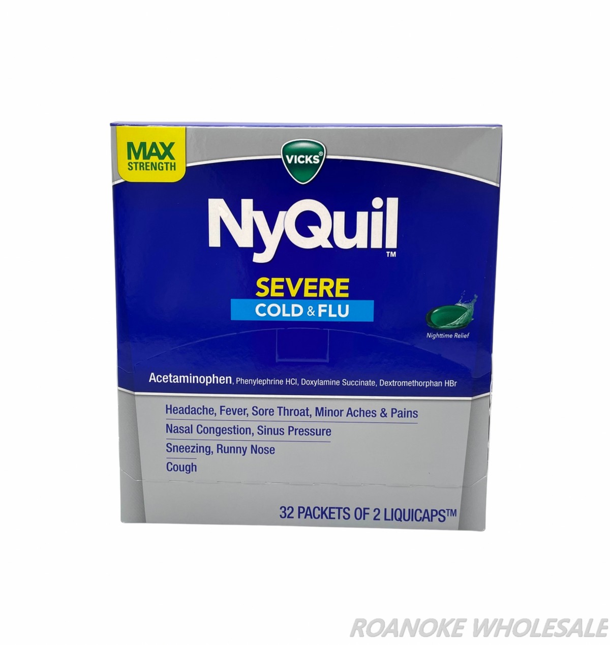 LOGIN FOR PRICEVicks Nyquil Severe Cold & Flu Nighttime Relief Liquid delivers maximum symptom fighting ingredients to relieve your worst cold symptoms. Nyquil Severe relieves cough, headache, fever, sore throat, minor aches and pains, nasal congestion, sinus pressure, sneezing & runny nose so you can get the rest you need. Contains acetaminophen. Use as directed. Keep out of reach of children. *Data represents brand/product selections from the 2020 Pharmacy Times Survey of
