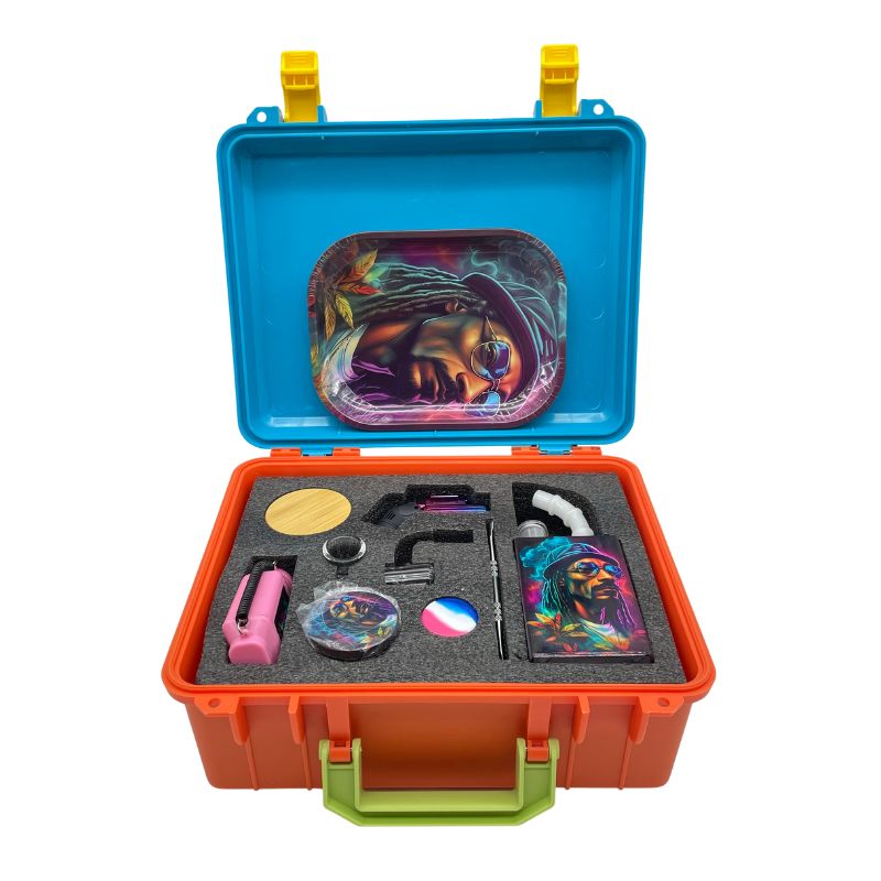 Kit Includes: Metal Rolling Tray Grinder Glass Container Silicone Container Dab Tool Water Pipe 14mm Banger Torch Lighter
