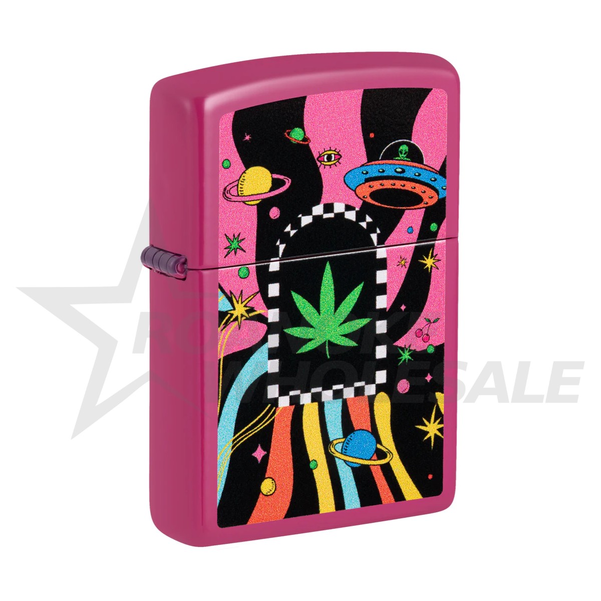 Let this shocking Frequency lighter transport you to another world. A bold cannabis leaf anchors the Color Image design, surrounded by curious space creatures and vibrant planets. Comes packaged in a gift box.