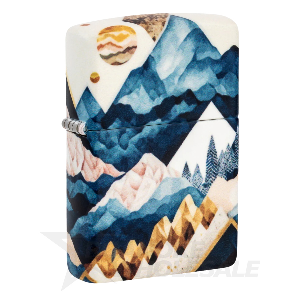 A soothing mountain range collage extends around all sides of this gorgeous 540 Color lighter, depicted in natural, organic tones. Comes packaged in a gift box.