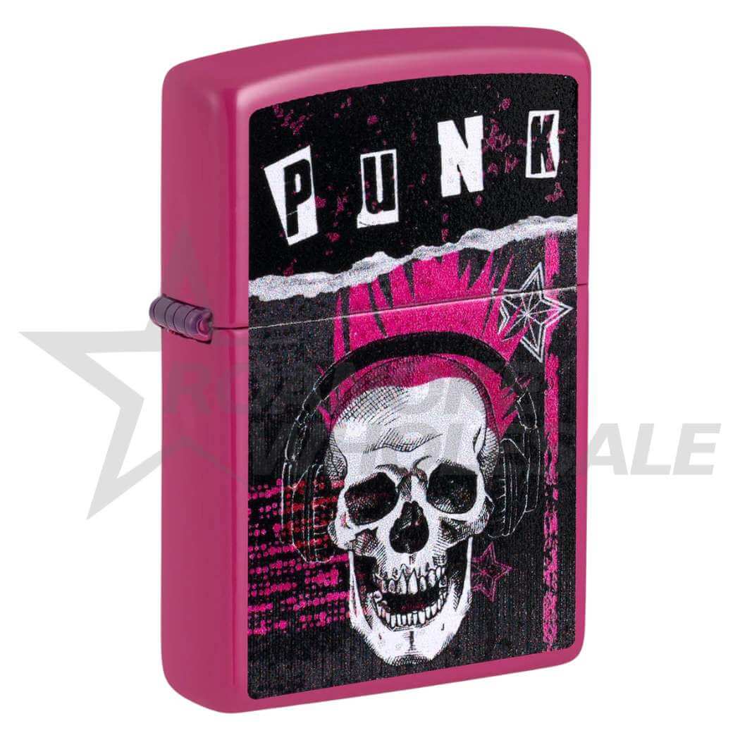 A grinning skull rocks out to music on this shocking pink Frequency lighter. The Color Image design is crowned with the word, "PUNK," depicted in ransom-style letters. Comes packaged in a gift box.