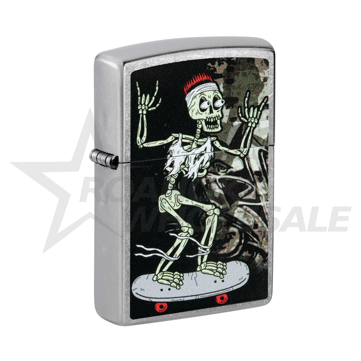 Skateboarding is life and then some. A gnarly skeleton skates across the surface of this classic Street Chrome lighter in a playful Color Image design. Comes packaged in a gift box.