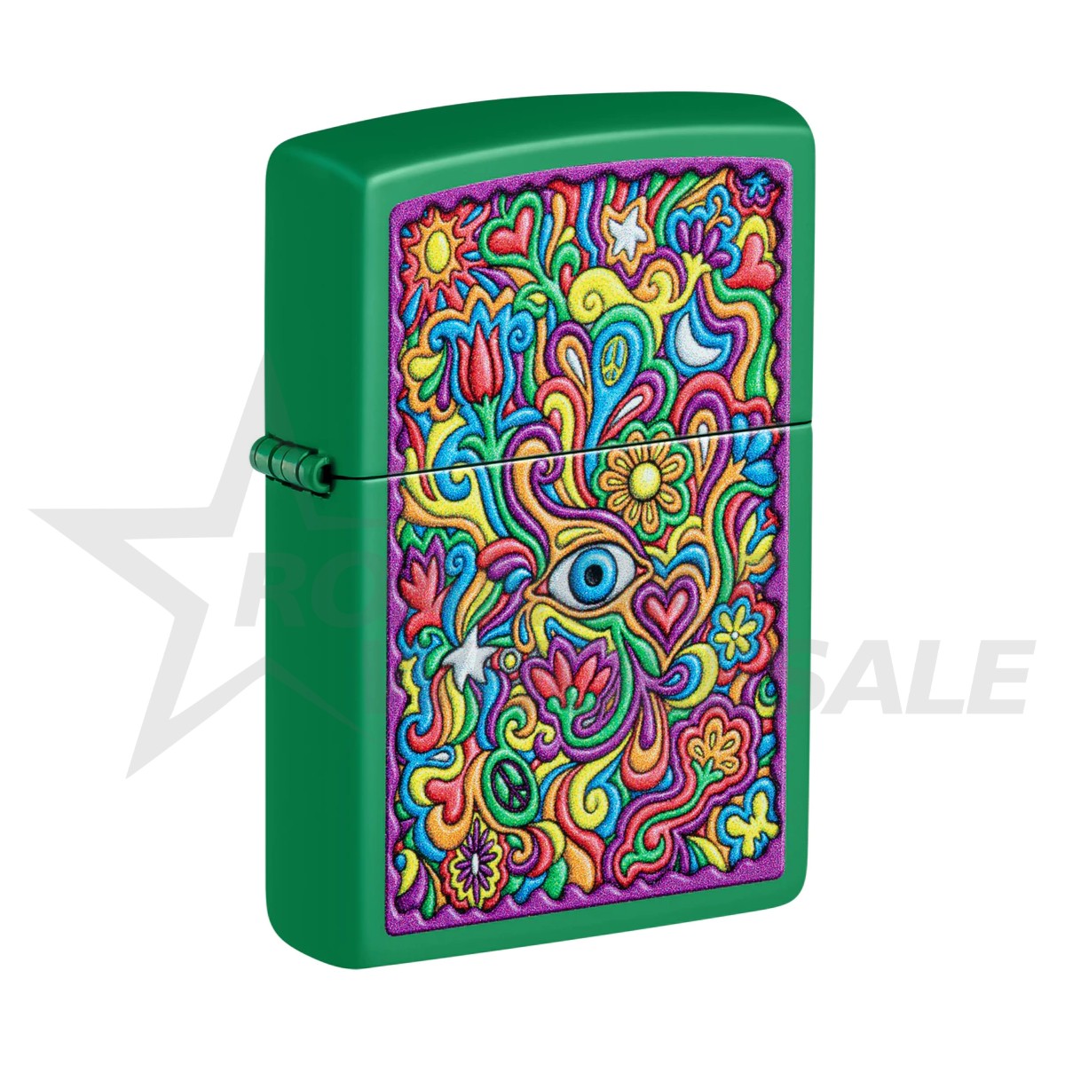 Love, peace and grooviness abound with this bright and funky Grass Green Matte lighter featuring a hypnotically abstract Color Image design. Comes packaged in a gift box.